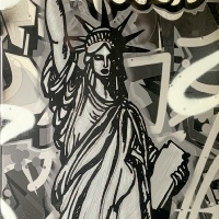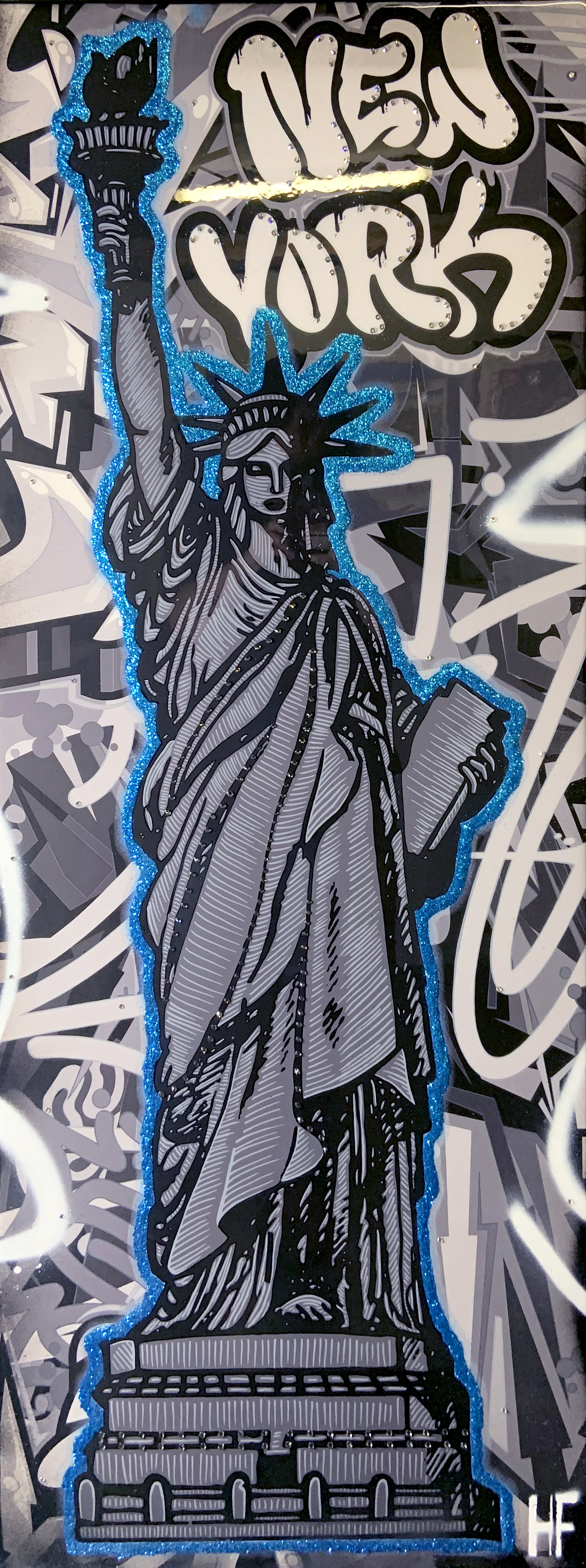 TALL STATUE NY TAG B&W BLUE
